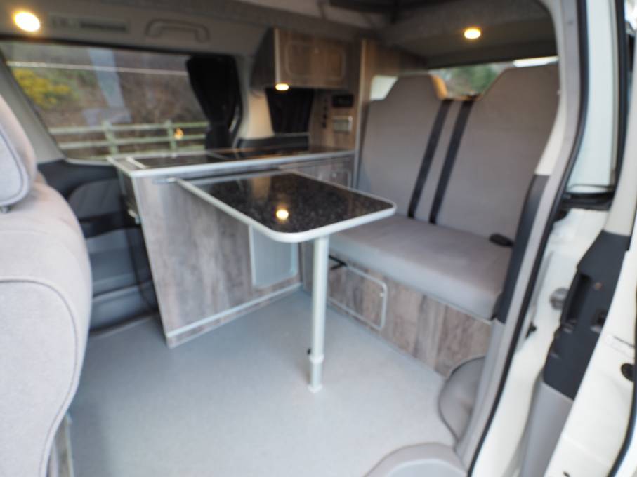 A comprehensive conversion includes the Poptop and bed board providing the 3rd and 4th berths to compliment the electric rock n roll bed which provides the additional sleeping space. Finished in a striking red and black leather with red highlights such as the red poptop canvas, red LED lighting and red detailing to the front grill, the T5.1 sits on attractive black alloys with a sparkle finish. A leisure battery provides 12v electrics and there is 230v electric hook-up. A gas bottle is fitted to power the 2 burner gas hob and heating is via a diesel heater with separate control panel. Alongside the hob is a sink with tap, a microwave oven and a fridge with freezer box. The front passenger seats swivel into the main habitation area and along with the pop-up table creates a relaxing place to dine and entertain. There is a padded footstool with built in porta-potti.
