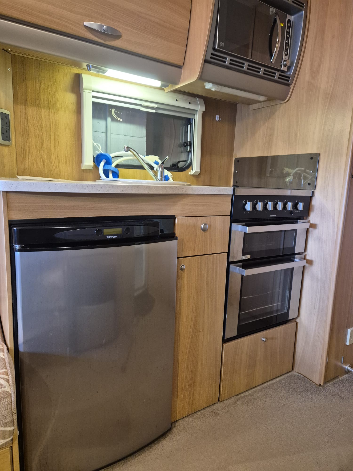 Home from home comforts with a fully featured kitchen providing a 3-burner gas hob and electric hot plate, separate oven and grill, sink with mixer tap, microwave oven and under counter 3-way fridge. The private washroom has a flushing cassette toilet, sink and vanity mirror with storage and a separate shower cubicle. The light and fresh furnishings provide a comfortable lounge with two table options to make a great place to dine and entertain. An Avtex TV is fitted and at night the twin side sofas can be used as small single beds or pull together to create a large double bed. Plenty of storage in the overhead lockers, wardrobe, cuoboards and drawers.