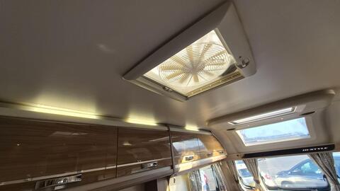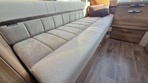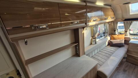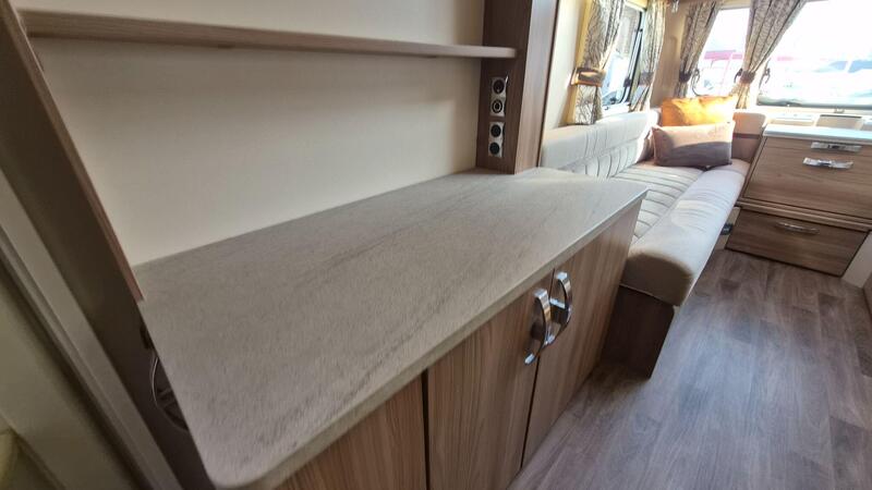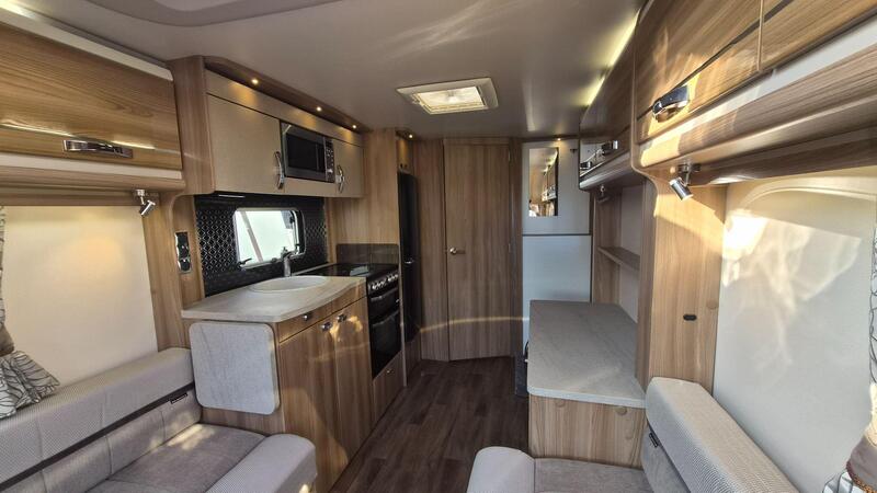 Home from home comforts with a fully featured kitchen providing a 3-burner gas hob and electric hot plate, separate oven and grill, sink with mixer tap, microwave oven and under counter 3-way fridge. The private washroom has a flushing cassette toilet, sink and vanity mirror with storage and a separate shower cubicle. The light and fresh furnishings provide a comfortable lounge with two table options to make a great place to dine and entertain. An Avtex TV is fitted and at night the twin side sofas can be used as small single beds or pull together to create a large double bed. Plenty of storage in the overhead lockers, wardrobe, cuoboards and drawers.
