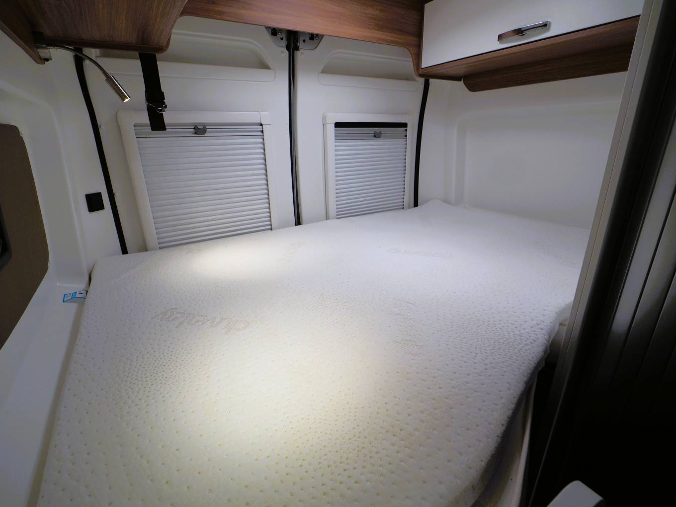 The rear bed can be stored out the way to allow a walk through the vehicle and provide further storage space when travelling. Plenty of storage from roof mounted lockers along both sides and deep undercounter draw space in the kitchen area. Externally there is a Thule Omnistor wind out sun canopy and the usual access points for electric hook-up and water.